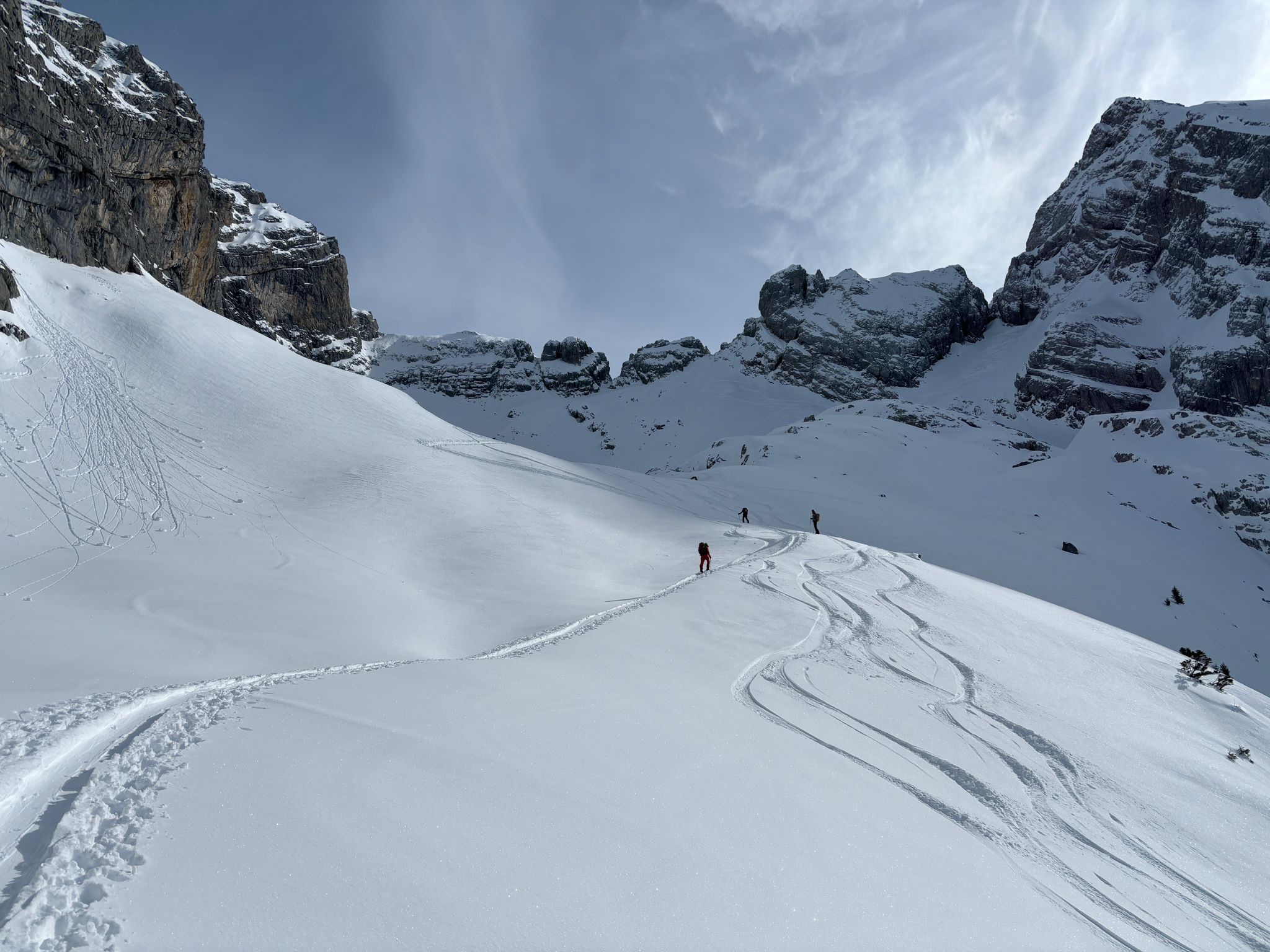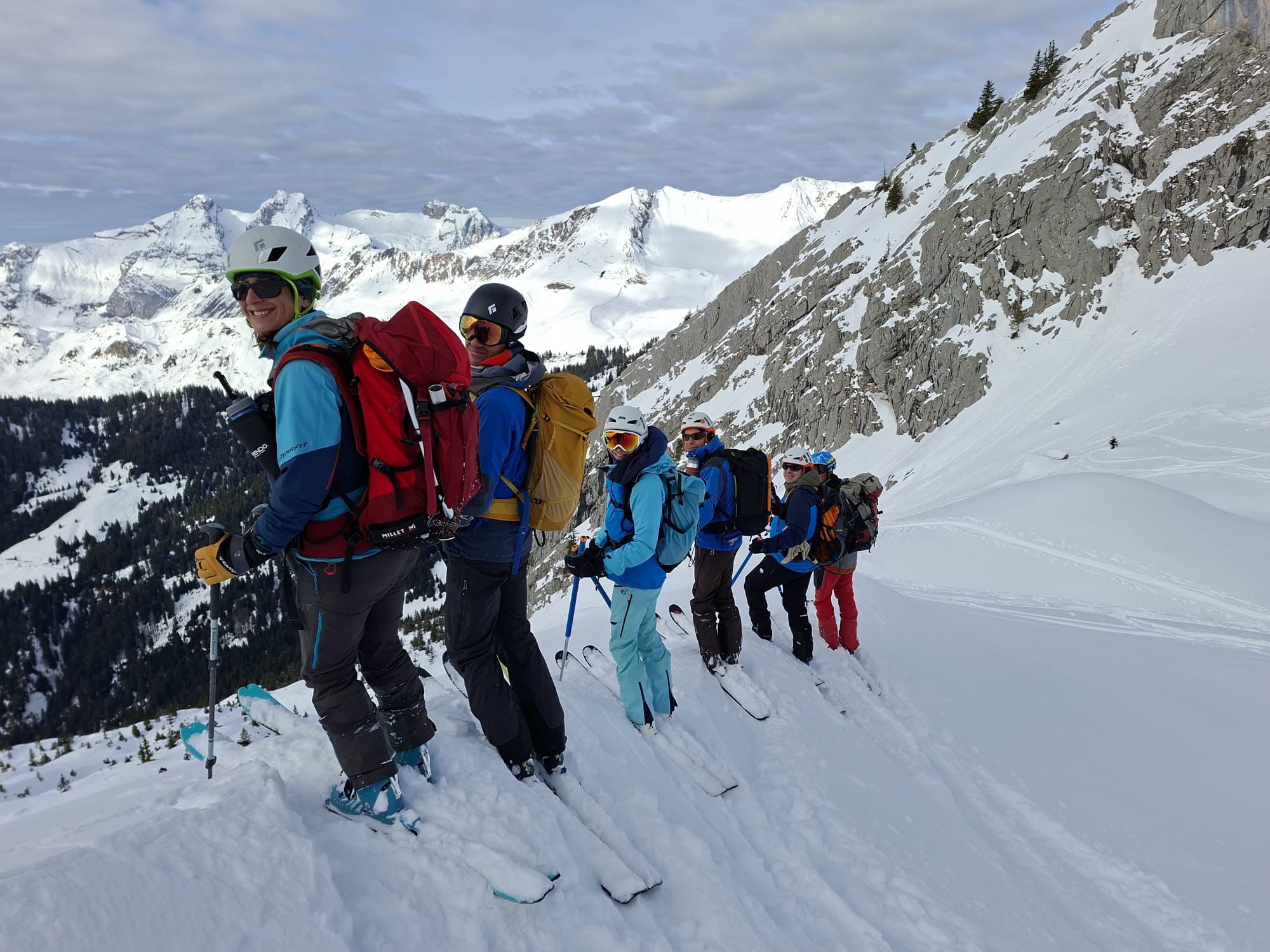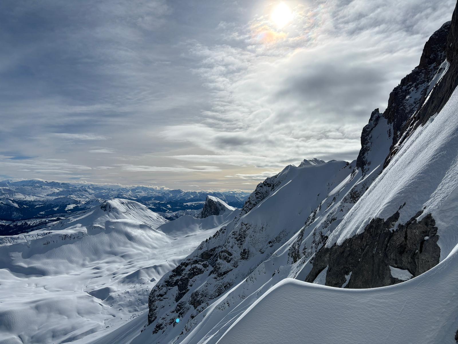 J2 : deux combes au programme avant de redescendre au grand Bornand. Nous débutons notre course par une descente dans la magnifique poudreuse, direction le bas de la combe de chombas. Nous y déposons quelques affaires pour s'alléger. Direction la combe de Charvet, très sauvage avec une belle neige de cinéma ! Panorama magnifique avec vue jusqu'aux Ecrins. Puis retour dans la combe de Chombas et montée dans un petit couloir qui nous offre un panorma exceptionnel. Descente délicieuse jusqu'à ce que l'on reprenne nos affaires. Dernière descente "sanglier"dans un canyon qui aura eu raison de nos cuisses...Retour à l'auberge nordique, puis bus jusqu'au grand Bornand et remontée en télecabine avec le forfait randonneur jsqu'au chinaillon. De bons et beaux souvenirs dans les Aravis, où d'autres combent restent encore à visiter...