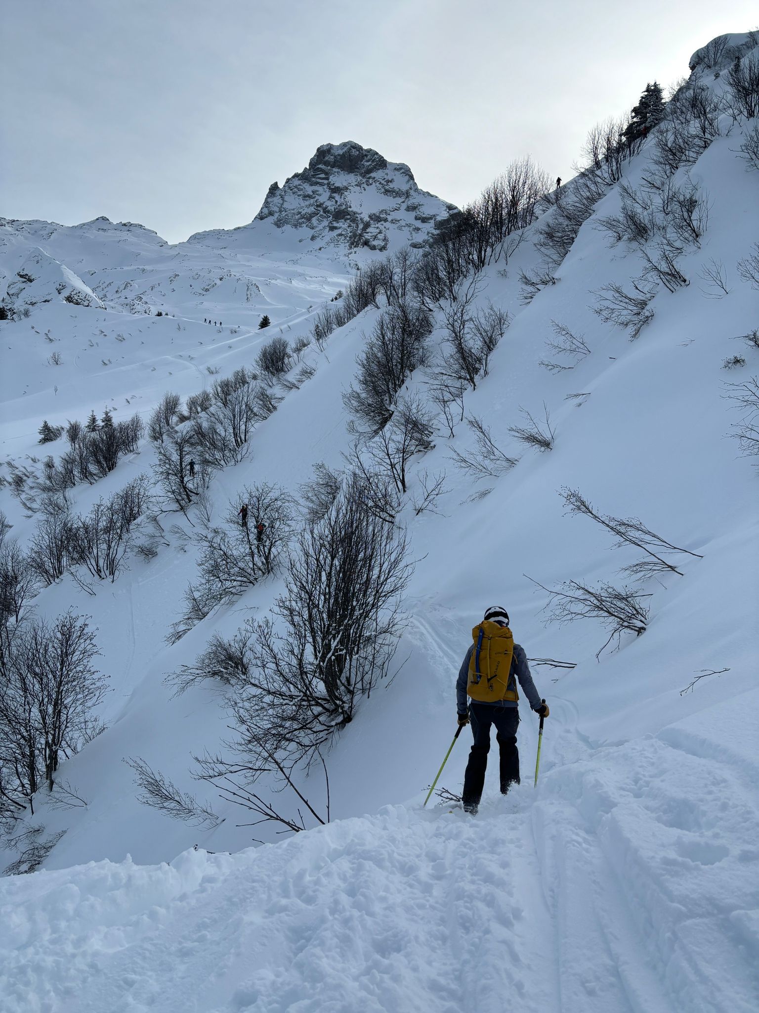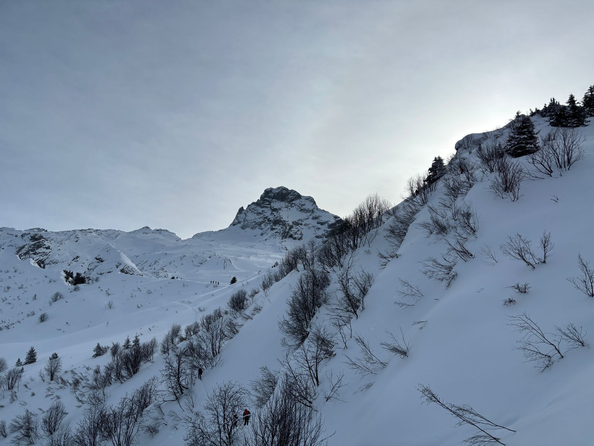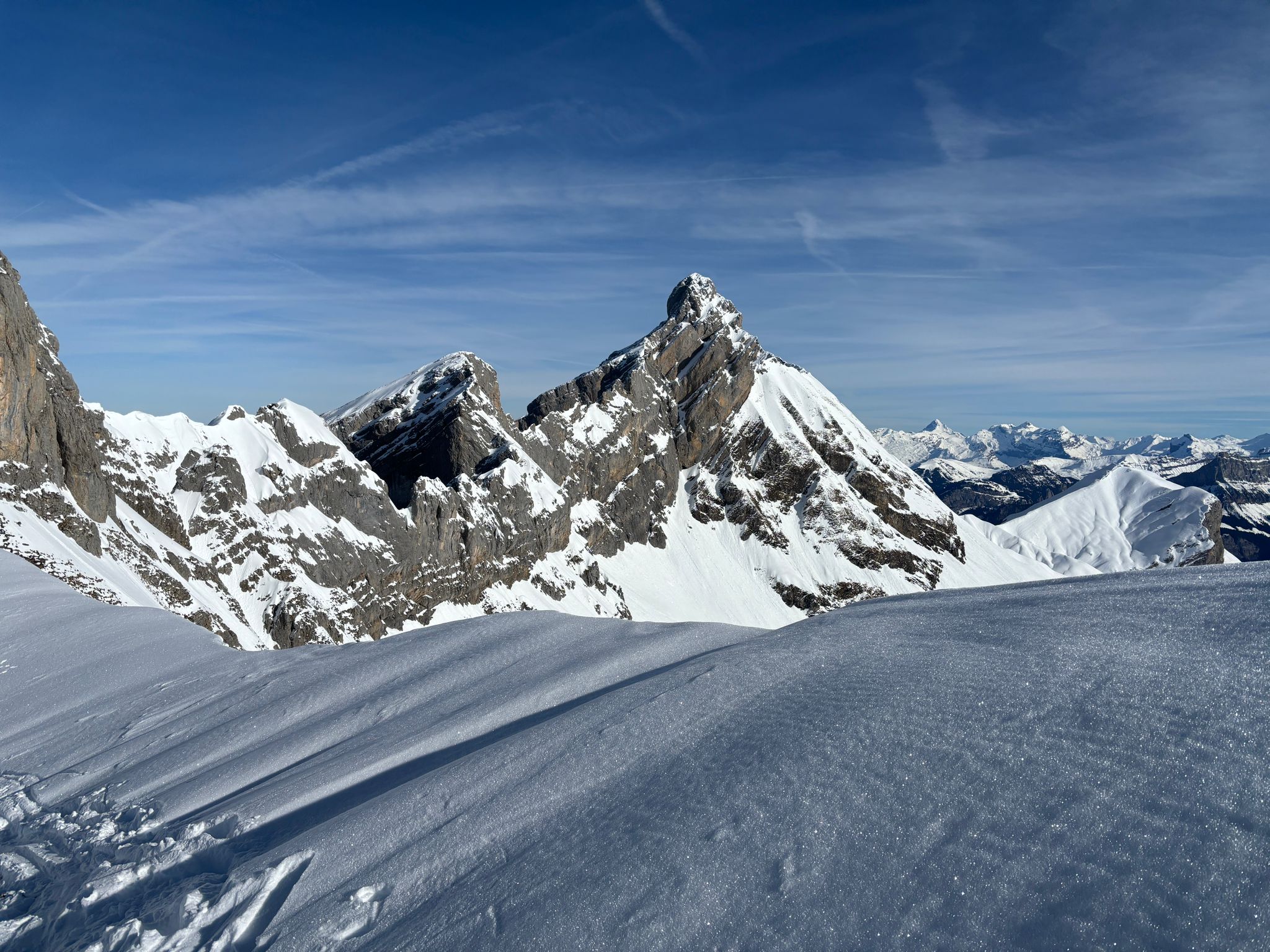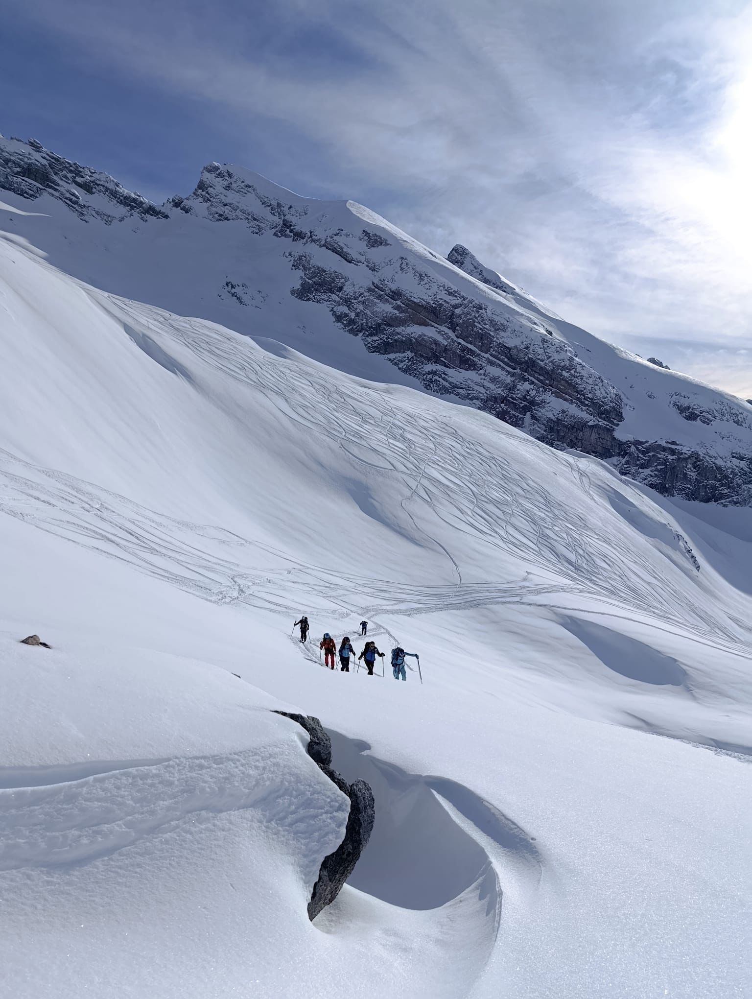 J2 : deux combes au programme avant de redescendre au grand Bornand. Nous débutons notre course par une descente dans la magnifique poudreuse, direction le bas de la combe de chombas. Nous y déposons quelques affaires pour s'alléger. Direction la combe de Charvet, très sauvage avec une belle neige de cinéma ! Panorama magnifique avec vue jusqu'aux Ecrins. Puis retour dans la combe de Chombas et montée dans un petit couloir qui nous offre un panorma exceptionnel. Descente délicieuse jusqu'à ce que l'on reprenne nos affaires. Dernière descente "sanglier"dans un canyon qui aura eu raison de nos cuisses...Retour à l'auberge nordique, puis bus jusqu'au grand Bornand et remontée en télecabine avec le forfait randonneur jsqu'au chinaillon. De bons et beaux souvenirs dans les Aravis, où d'autres combent restent encore à visiter...