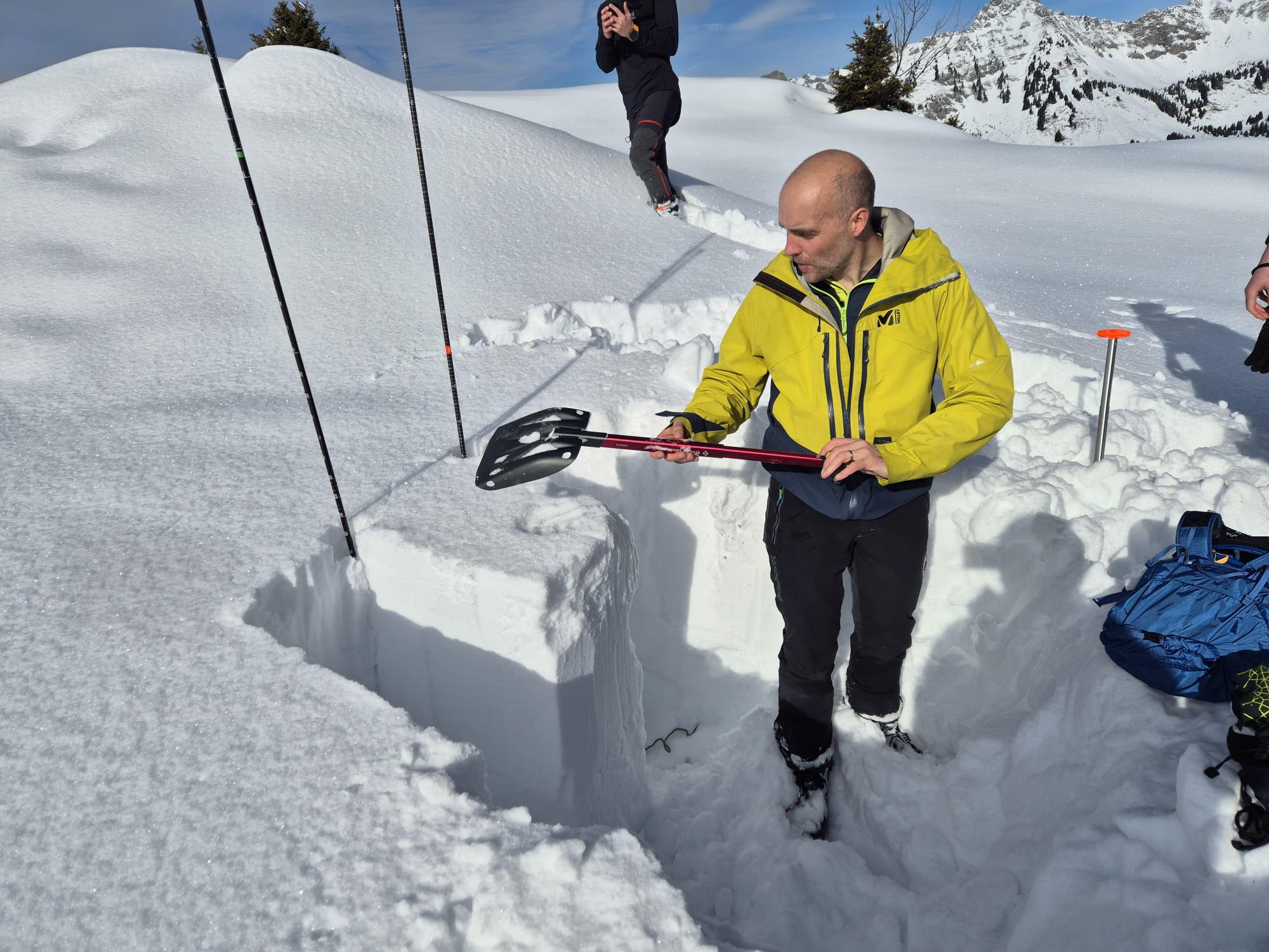 Après un aller retour au sommet, pause repas avec une vue à couper le souffle, avant d'attaquer l'atelier étude de la neige, stratigraphie et test ECT.