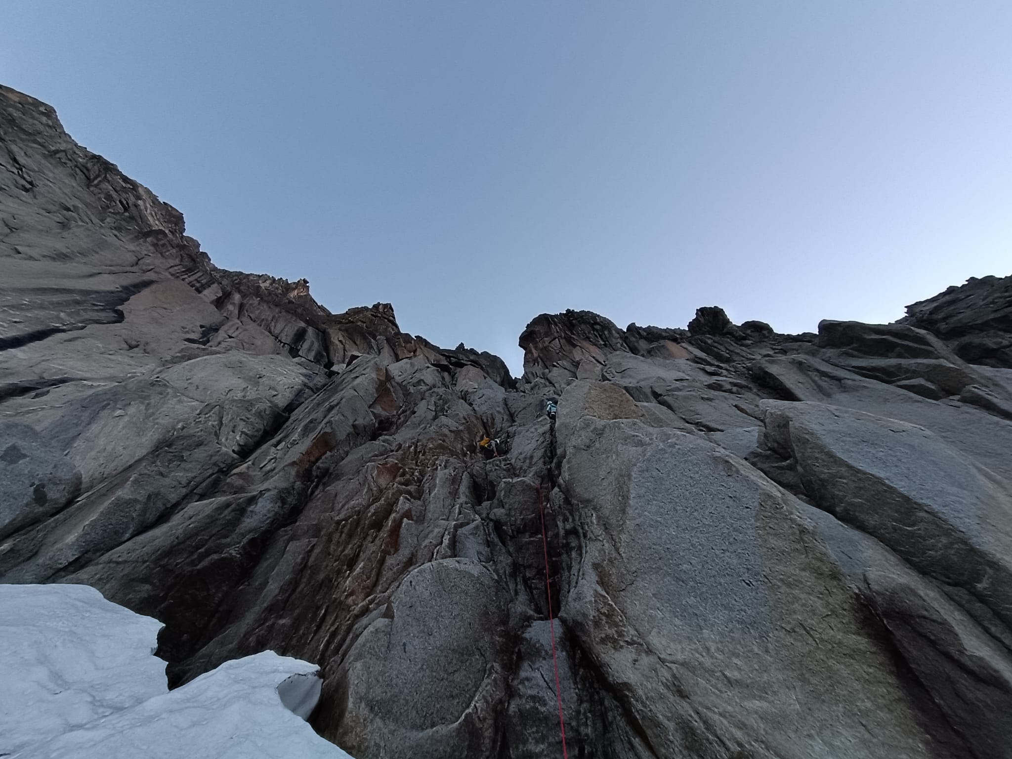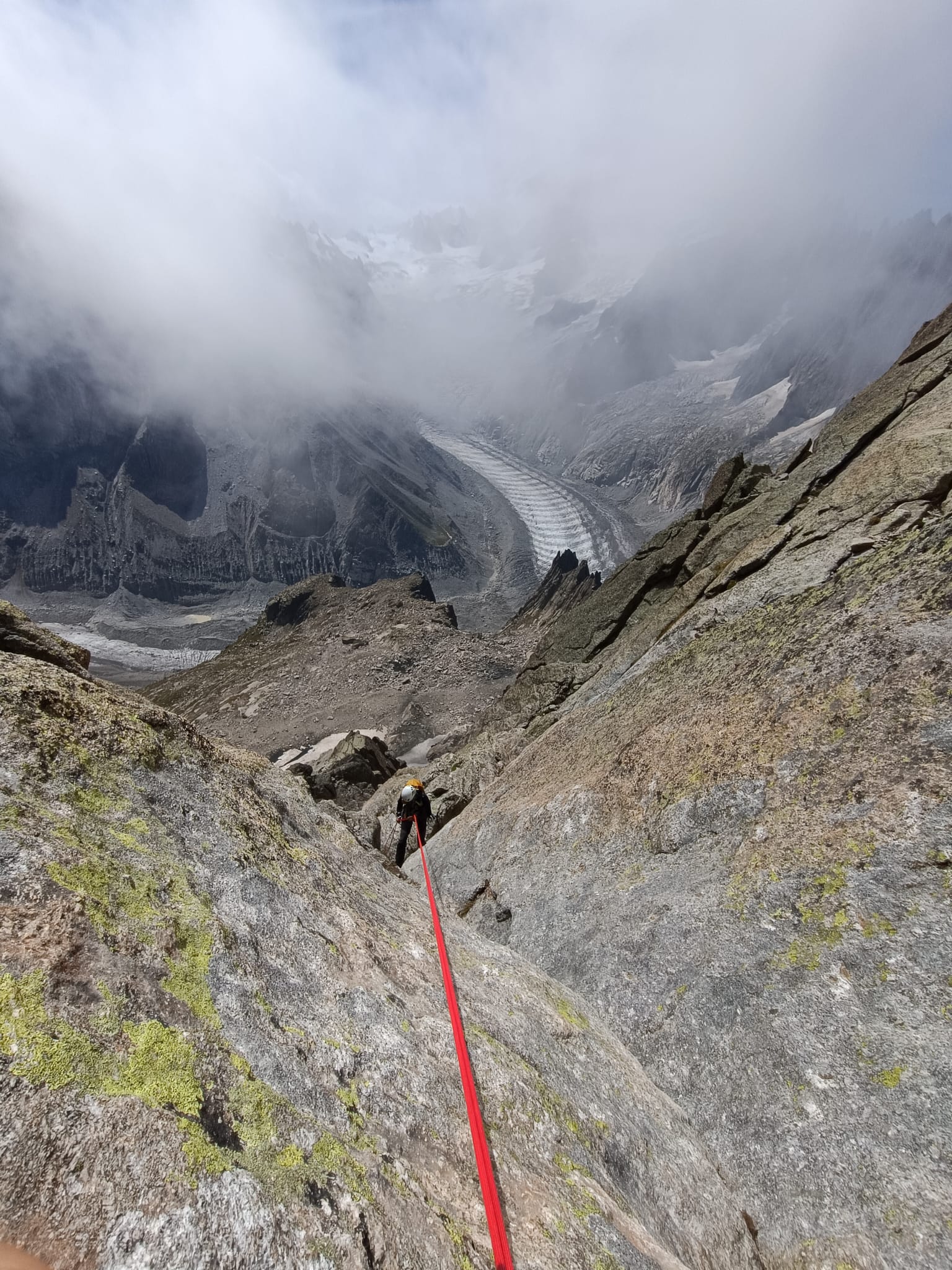 Le lendemain, lever matinal à 5h pour attaquer la belle aiguille du Moine. Après un départ rapide et l’approche du glacier, nous entamons les premières longueurs sur ce tas de cailloux.