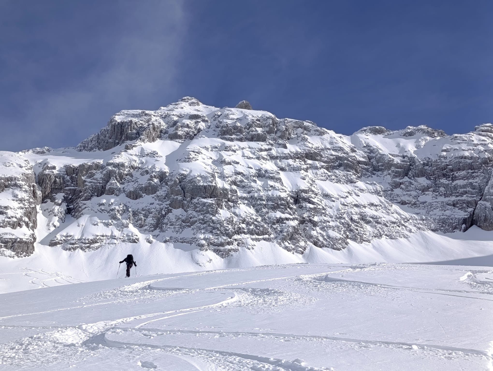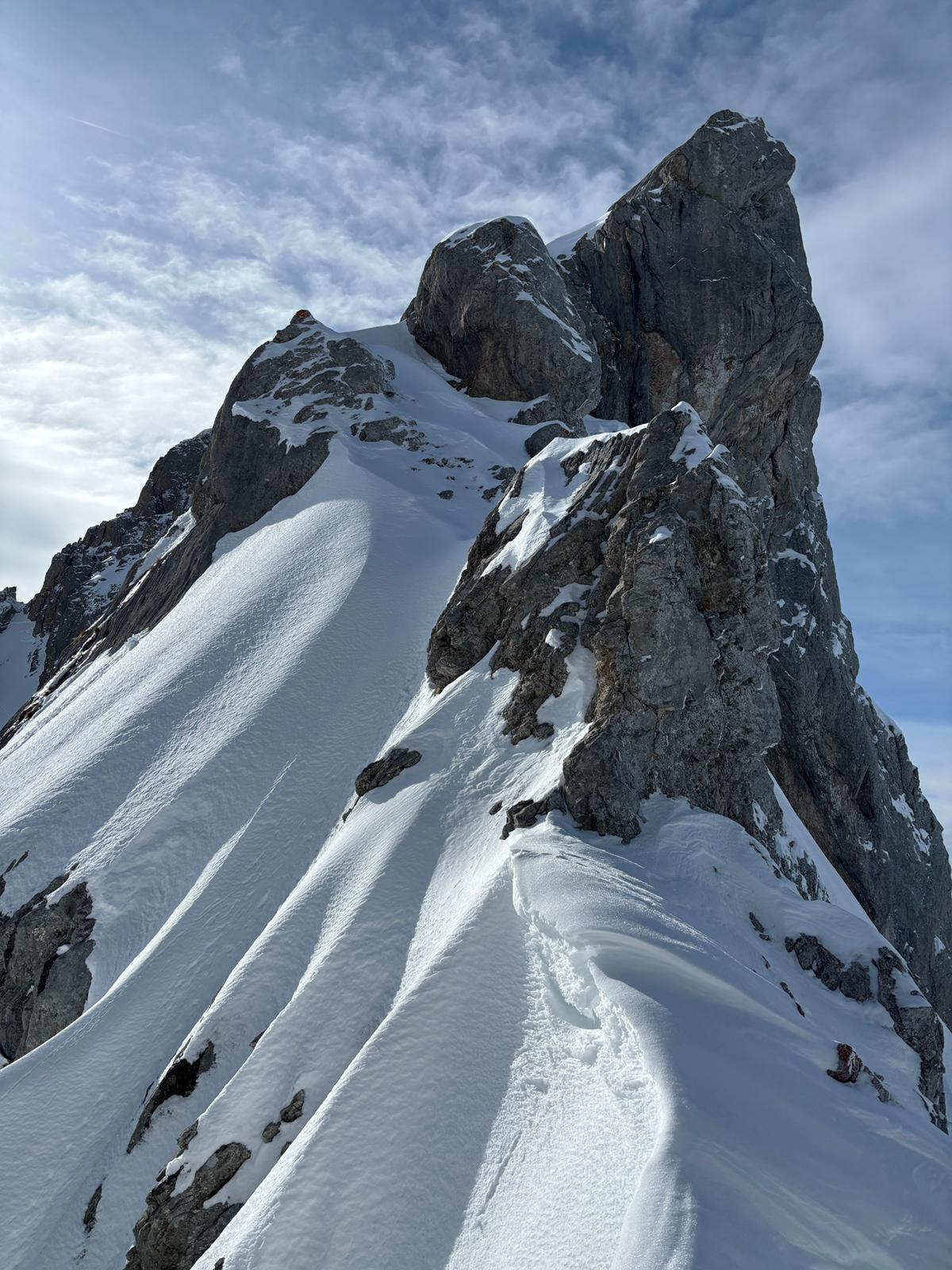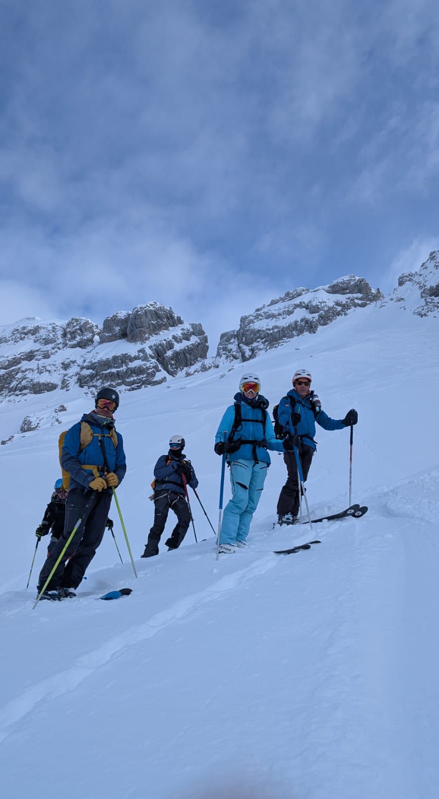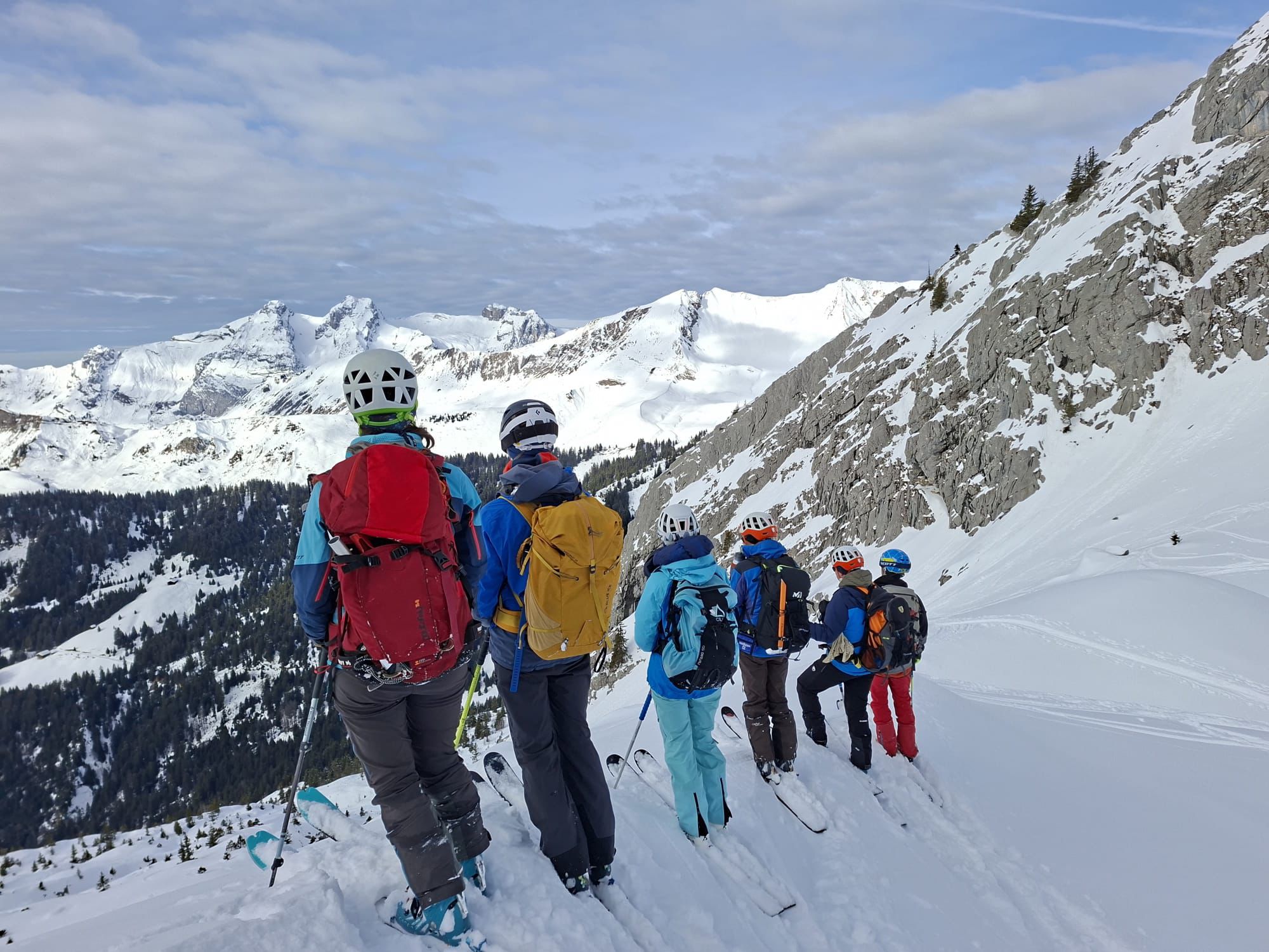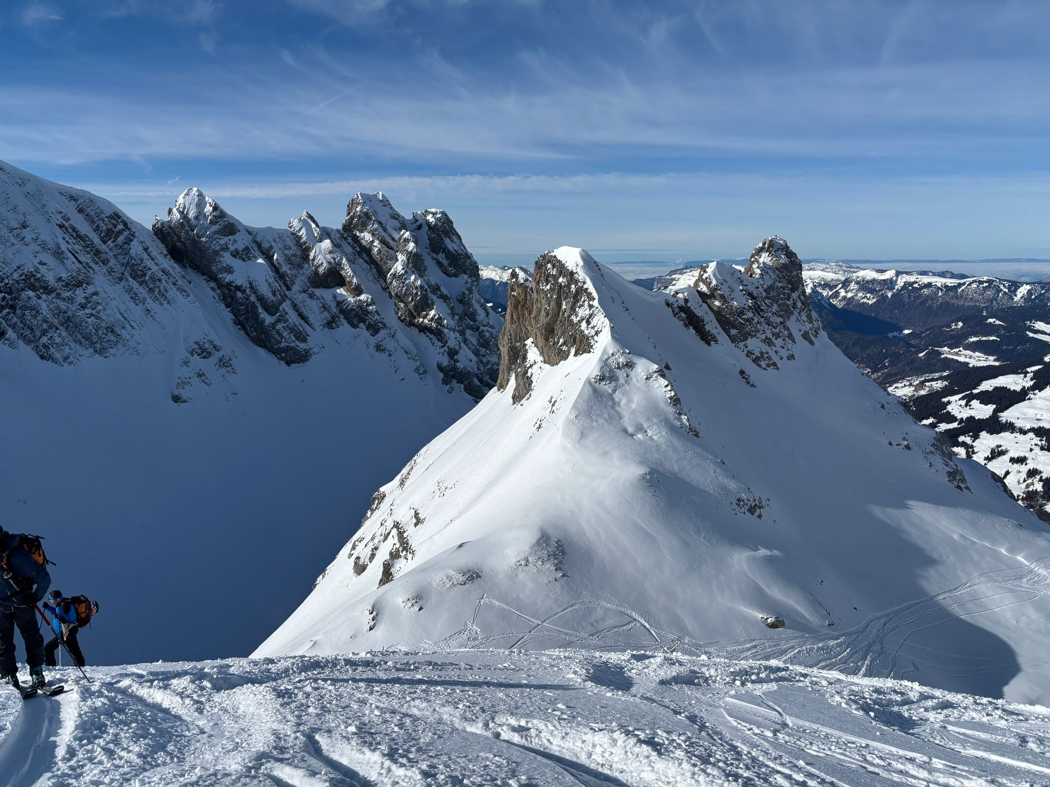 J2 : deux combes au programme avant de redescendre au grand Bornand. Nous débutons notre course par une descente dans la magnifique poudreuse, direction le bas de la combe de chombas. Nous y déposons quelques affaires pour s'alléger. Direction la combe de Charvet, très sauvage avec une belle neige de cinéma ! Panorama magnifique avec vue jusqu'aux Ecrins. Puis retour dans la combe de Chombas et montée dans un petit couloir qui nous offre un panorma exceptionnel. Descente délicieuse jusqu'à ce que l'on reprenne nos affaires. Dernière descente "sanglier"dans un canyon qui aura eu raison de nos cuisses...Retour à l'auberge nordique, puis bus jusqu'au grand Bornand et remontée en télecabine avec le forfait randonneur jsqu'au chinaillon. De bons et beaux souvenirs dans les Aravis, où d'autres combent restent encore à visiter...