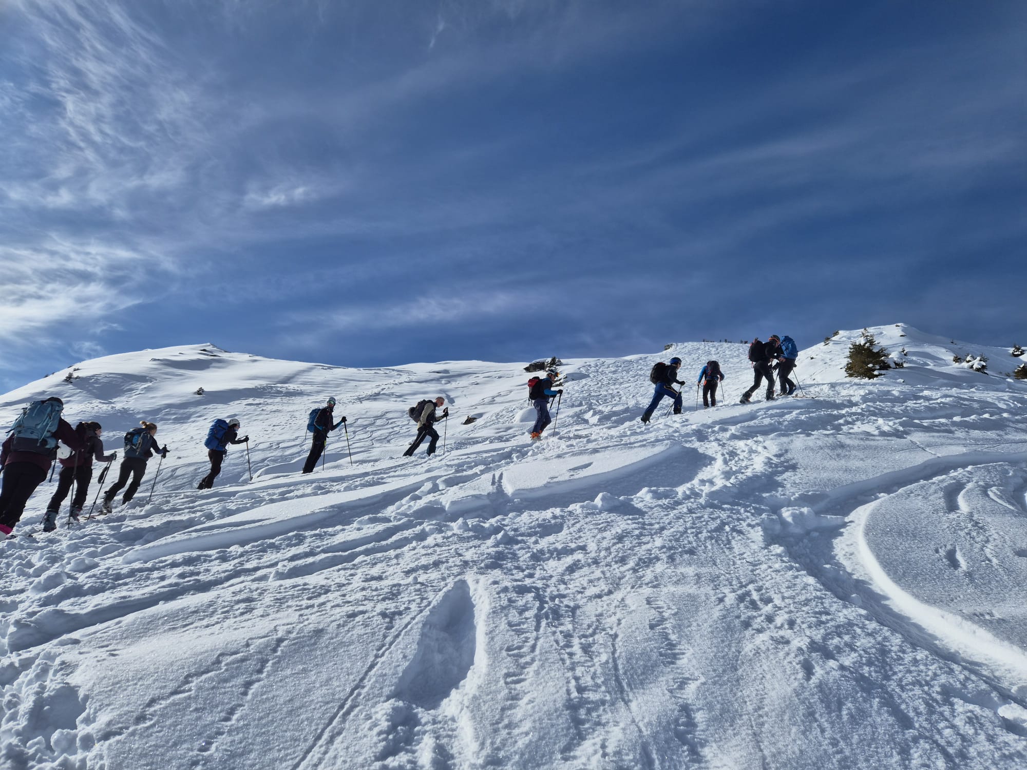 Après un aller retour au sommet, pause repas avec une vue à couper le souffle, avant d'attaquer l'atelier étude de la neige, stratigraphie et test ECT.